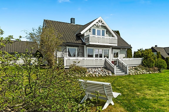 Lekker enebolig med dobbelgarasje og solrike uteområder. Stor hage innerst i rolig blindvei på Leie