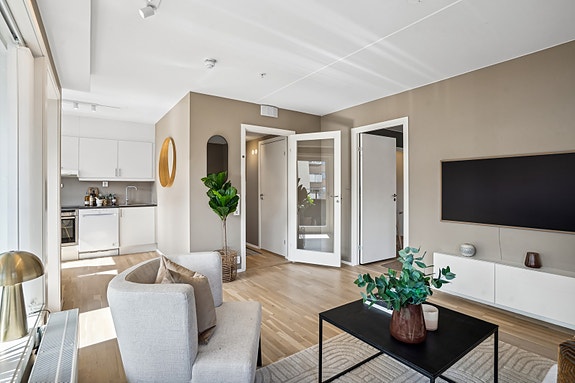 Pen 2-roms hjørneleilighet i nybygg fra 2015. Heis. Innglasset balkong. Vv og fyring inkl. Ingen dok.avgift!