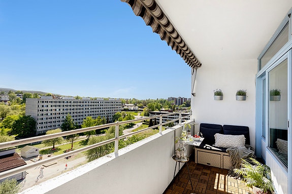 Fra stuen er det videre utgang til solrik balkong på 7 kvm med flott og frodig utsyn.