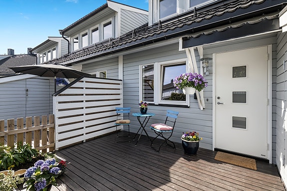 Ved inngangspartiet finner man også en hyggelig terrasse, et perfekt sted for å innta frokosten dersom været tillater.