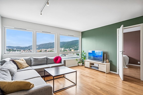 Dette er en flott 5-roms leilighet med en fantastisk utsikt over Byfjorden, sentrum og byfjellene. Leiligheten ligger i andre etasje, og har en smart planløsning. Dette er opprinnelig en romslig 4-roms leilighet, men i senere tid er det bygget et ekstra soverom. Det er godt med bodplass tilhørende leiligheten, og det følger også med en fast garasjeplass klargjort for elbil-lader. Leiligheten har også en balkong.