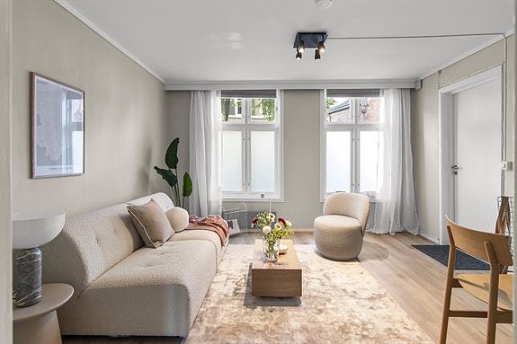 Selve leiligheten ligger i en koselig bygård. Leiligheten ligger i byggets byggets første etasje og er innredet m/bl.a. stue m/plass til spisebord, separat kjøkken, soverom m/garderobe, samt baderom/wc/vaskerom. Lagringsbod i kjeller og i uthus. Utfor soverommet er det en egen terrasse. Leiligheten har i 2024 blitt oppusset m/bla. maling av diverse innvendige overflater og ny , samt det er nyere kjøkkeninnredning og ny baderomsinnredning.