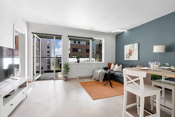 Moderne 2-roms med stor, vestvendt balkong på 13,5m². Bad 2018. VV og fyring inkl. Heis. Skjermet i grønne omgivelser!