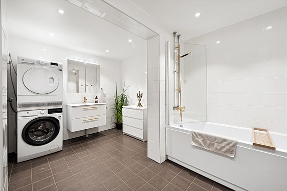 Totalrenovert bad i 2023. Med dusj i badekar får man det beste av to verdener, varme bad og kalde dusjer etter behov.