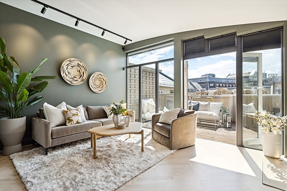 TOPPLEILIGHET MED EKSKLUSIV STANDARD. Hybeldel. Vannbåren varme i gulv. Takterrasse + 2 balkonger. Heis og p-kjeller.
