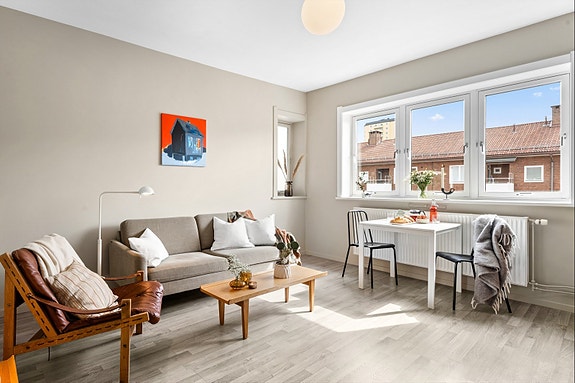 Sjarmerende 2-roms toppleilighet m. teglsteinvegg. "Alt" inkl. i felleskostn. Populært borettslag m. idyllisk bakgård.