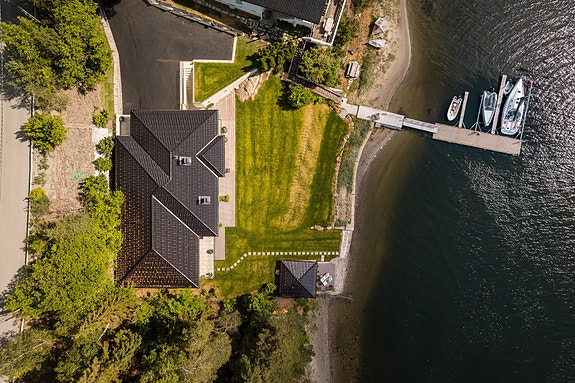 Arkitekttegnet strandeiendom fra 2022, av L. Gedde-Dahl. Høy standard. Badehus og dypvannsbrygge. Usjenert tomt.
