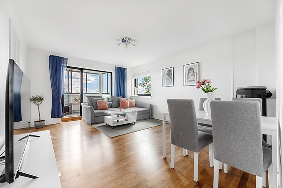 Lys og påkostet 3-roms topp-/ og endeleilighet | Sydvendt innglasset balkong | Peis |Kort vei til kollektiv | Garasje