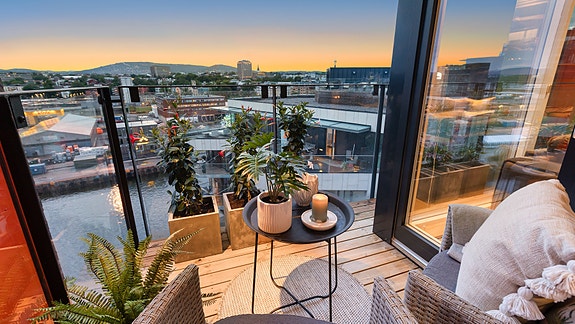 Sjønær og attraktiv 4-roms beliggende høyt og luftig i 10. etasje med balkong, felles takterrasser og garasje