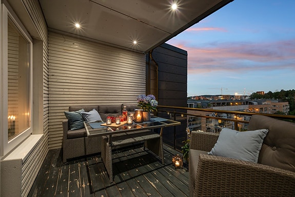 -Balkong på ca. 9 kvm med bod på ca. 2,2 kvm.