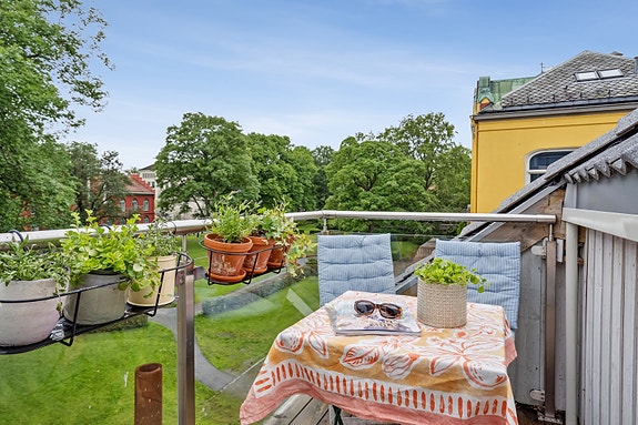 Sjarmerende & sentral 2-roms selveier. Lite innsyn. Solfylt takterrasse vendt ut mot park. Nyere tak. Nærhet til "alt"