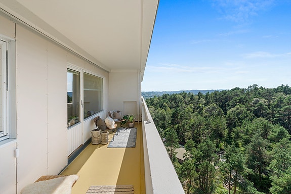 Her bor du fritt og fint til i 10. etasje med naturskjønn utsikt fra balkongen. Leiligheten har romslige rom og en god planløsning - med litt ekstra kjærlighet og noen malingsstrøk har du et godt utgangspunkt for å skape din egen drømmeleilighet! Beliggenheten er prima med gangavstand til busstopp, butikk, treningssenter og kort kjøreavstand til både Oasen senter og Bergen sentrum