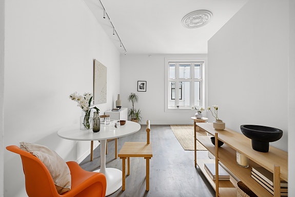Stilfull andelseilighet med smart planløsning og god takhøyde i klassisk bygård. Romslig alkove. Perfekt førstegangskjøp