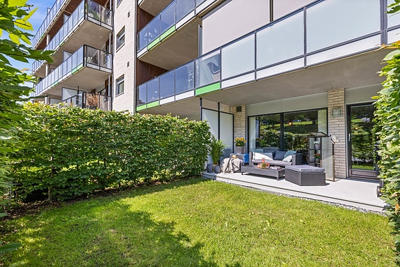 Pen 3-roms selveier fra 2013 med solrik terrasse på 10,5 kvm og hage | Garasjeplass med lader | Heis | V.v & fyring