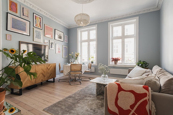 Svært innbydende, klassisk 2-roms med solrik balkong. Rosett, stukkatur, generøs takhøyde. Originale tregulv og peis.
