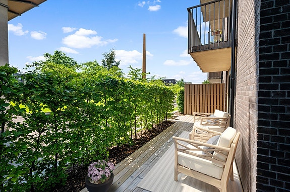 Fra stuen er det utgang til en stor og herlig markterrasse på hele 34 kvm, som strekker seg langs stuen og videre rundt hjørnet.