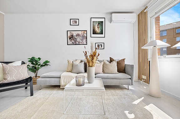 Velkommen til Leif Dietrichsons gate 12G. Romslig stue med plass for sittegruppe.