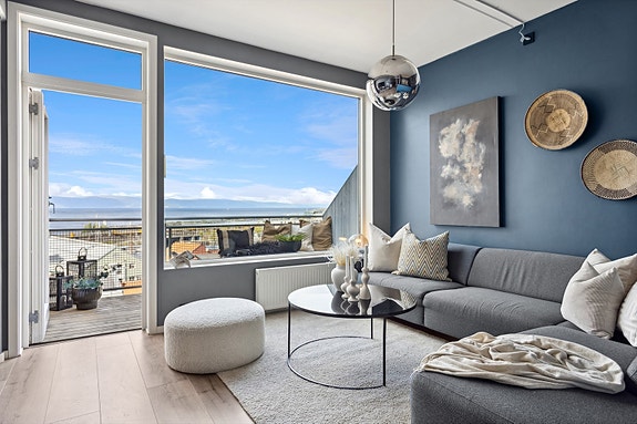 Moderne toppleilighet. Strøm, fjernvarme mm. inkl. i felleskost. Privat veranda. Fjordutsikt. Felles takterrasse. Heis.