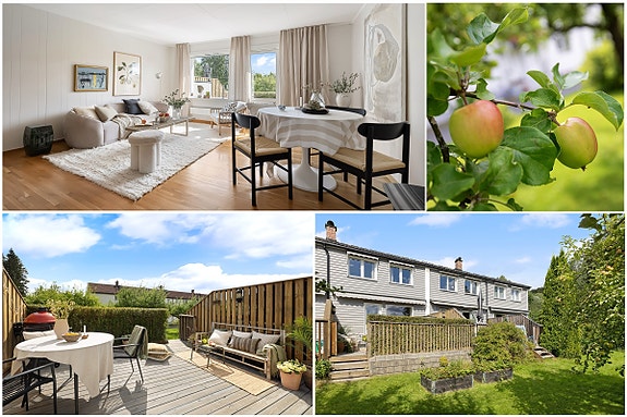LYCKLIGA GATAN! Sjarmerende rekkehus med solrik terrasse, felles hage og garasje m/lader til elbil.