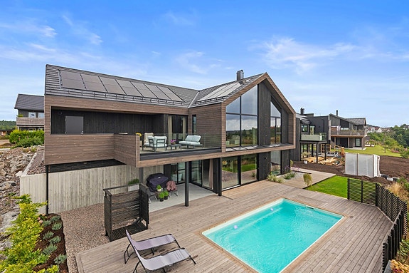 En ny enebolig over 2 plan med påkostet materialvalg, oppvarmet motstrøms basseng, utsikt solrik tomt og dobbel garasje.