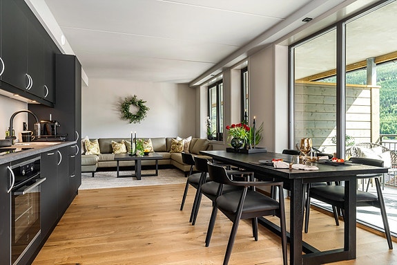 Lys og moderne leilighet med åpen planløsning og store vinduer, som gir rikelig med naturlig lys og flott utsikt.