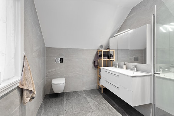 Den flotte hjørnebeliggenheten gir nabo kun på én side og planløsningen er god. Her får man et trivelig kjøkken med dels integrerte hvitevarer og spiseplass, samt en luftig stue med dagslys fra to sider. Videre er det et delikat bad som ble oppusset i 2022, med regndusj og opplegg for vaskemaskin. Det er to soverom - ett med garderobe, en innvendig bod og to eksterne boder.