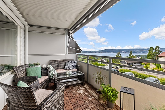 Velkommen til Kunterudveien 6 E, en stor 3-roms endeleilighet på 100 kvm med god planløsning over to etasjer og tilhørende garasjeplass. Den attraktive beliggenheten gir en nydelig, vidstrakt utsikt over Lierdalen og Drammensfjorden. Både utsikt og fine solforhold kan nytes på romslig, overbygd balkong utenfor stuen og på den meget store terrassen utenfor hovedsoverommet.
