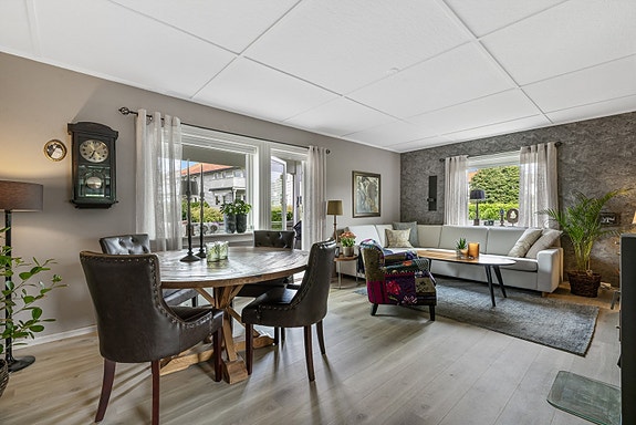 Stuen og spisestuen er et imponerende rom hvor store vindusflater, masse lys og herlig romfølelse dominerer inntrykkene.