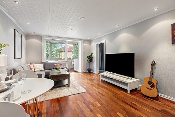 Herlig 3 roms i klassiske farger. Sydvendt, innglasset balkong og frodige fellesareal. Meget barnevennlig område.