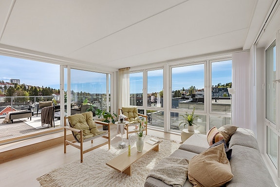 Dette er en unik og moderne 3-roms leilighet fra 2007 med en fantastisk terrasse på 42 m2. Leiligheten har en meget god planløsning, høy standard og en attraktiv beliggenhet i et veletablert og barnevennlig boligområde helt inntil marka. Store vindusflater som strekker seg fra gulv til tak med nydelig utsikt.