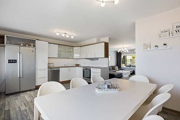Stort kjøkken med god plass til spisebord og stoler. Hvitevarer medfølger i handelen. Foto: Karl Filip Kronstad