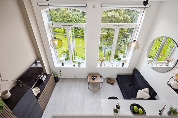 Lys & særegen studioleilighet med takhøyde på 3,30m - Hems på 9 m² - Store vindusflater - IN-ordning - Lave omkostninger