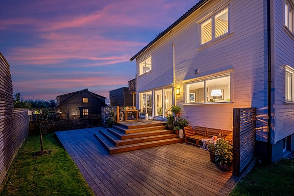Innholdsrik og renovert enebolig med flott og solrikt uteområde. 6 sov, 3 bad, flere stuer. Garasje. Barnevennlig.
