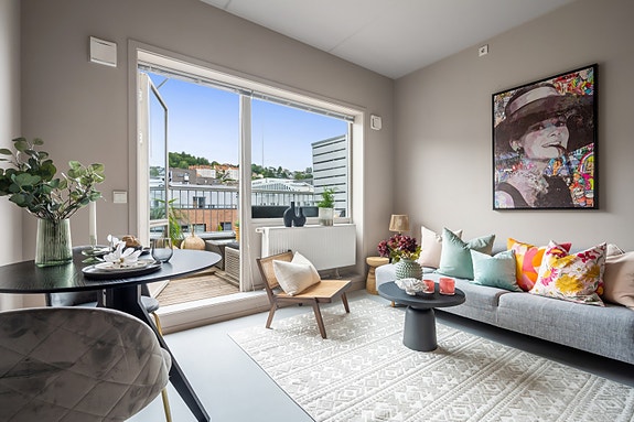 Pen arealeffektiv leilighet med god takhøyde og solrik terrasse