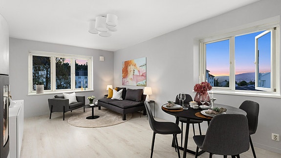 Store deler av leiligheten ble betydelig oppgradert i 2016. Innvendig blir man møtt av en åpen og luftig planløsning, og en delikat fargepalett som er lys og harmonisk. Den sosiale og gode planløsningen sørger for en luftig atmosfære, og vinduer i tre retninger gir rikelig med lysinnslipp. Den romslige stuen har god plass til sofagruppe og spisebord, og peisen gir rommet er lunt blikkfang. Leiligheten har et separat og pent kjøkkenet med god skap- og benkeplass og medfølgende hvitevarer. Videre kan leiligheten friste med et flislagt bad/wc og 2 gode soverom. Leiligheten disponerer to kjellerboder og én loftsbod.