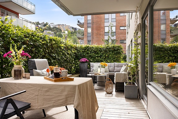 Lys, moderne og gjennomført 2-roms hjørneleilighet med 22 kvm markterrasse - IN-ordning - Felles, solrik takterrasse
