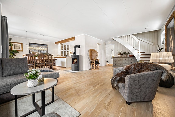 God planløsning over to etasjer med entré med skyvedørsgarderobe, stue med peis og kjøkken med spiseplass i 1. etasje. I 2. etasje finner man to soverom og bad med opplegg for vaskemaskin.
