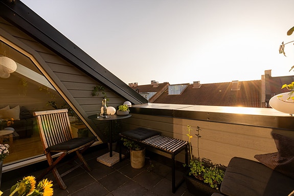 Lys, innbydende 3-r loftsleilighet. Solrik, vestvendt takterrasse- Gulvareal på 52 kvm - Rolig beliggende - IN-ordning!