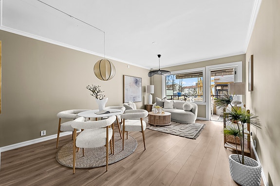 Leiligheten har en lys og trivelig stue, men vindusoverflater som gir rikelig med lys inn.