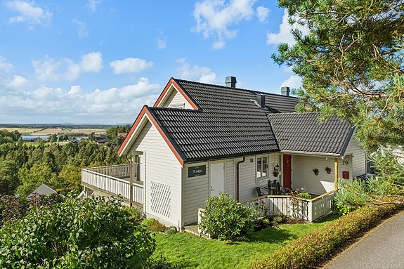 Enebolig i rekke med fantastisk, vidstrakt utsikt! Solrike terrasser! Innholdsrik. 3 plan. Garasje. Innerst i blindvei