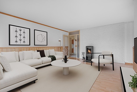 Komplett 3-(4) roms familieleilighet på ett plan der romslig entré har direkte tilgang til vaskerom. Utrolige 100 m2 med delvis åpen kjøkkenløsning, vaskerom og walk-in garderobe. Separat toalett og bad som kan slås sammen om ønskelig. Vedfyring for ekstra varme og hygge på kalde vinterdager.