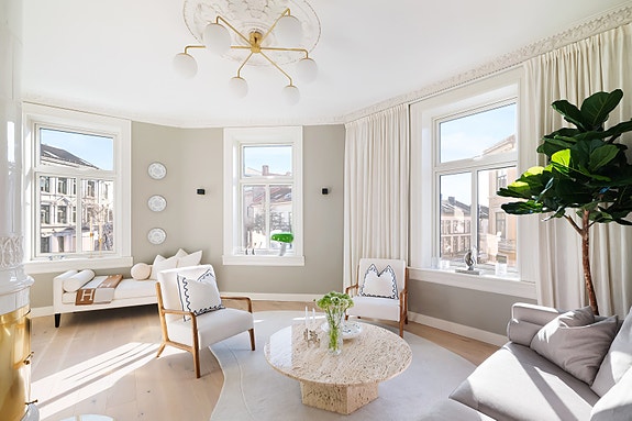 Leiligheten fremstår med duse, delikate farge- og materialvalg, balansert ventilasjon og vannbåren gulvvarme i flere rom. Stuen og kjøkkenet danner et stilfullt allrom med møbleringsfrihet, og kjøkkenet fra HTH har integrerte hvitevarer. Videre er det et helfliset bad/wc/vaskerom, et wc-rom, pen entré og tre gode soverom. Oppbevaringsplass finnes i garderobe, i innebod og i en kjellerbod.