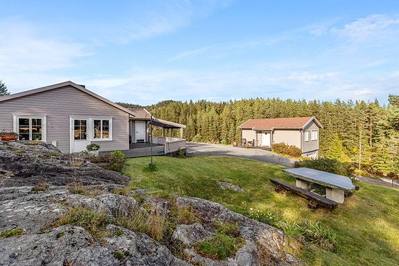 Landlig beliggende eiendom med enebolig på 1 plan, gjesteanneks m/ garasje og dobbelgarasje