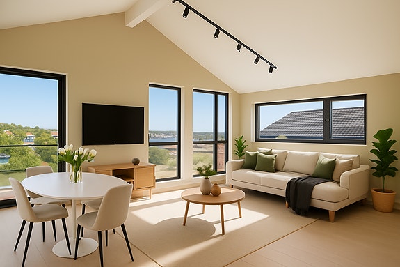 Dette er en bolig som kombinerer høy bokvalitet med en fantastisk beliggenhet. Enten du nyter utsikten fra verandaen, tar en spasertur langs elvebredden eller benytter deg av byens tilbud via den nærliggende fergen, vil du raskt føle deg hjemme her.