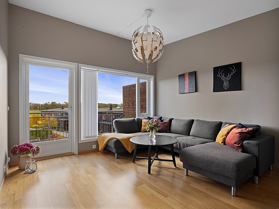 En lys og flott toppleilighet i lavblokk med sør-vendt utsiktsbalkong, parkering i carport og fine fellesområder. Boligen fremstår som velholdt og moderne. Ekstra takhøyde gir god romfølelse, og store vindusflater slipper inn rikelig med naturlig lys.