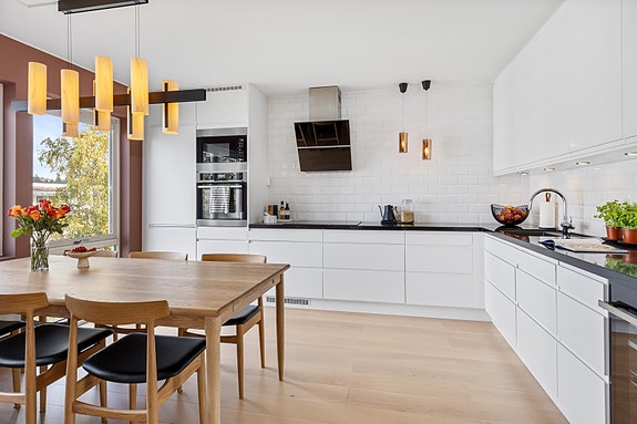Innredningen er av nyere dato, plassert i en romslig L-form, som gir god arbeidsflyt til matlaging og bakst.