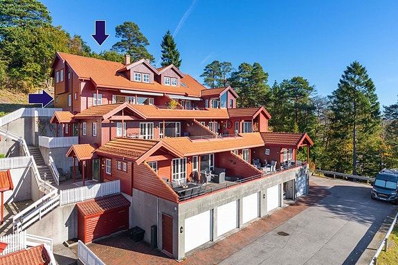 Romslig selveid terrasseleilighet i toppetasjen over 2 plan m/flott utsikt-Inngang fra bakkeplan-Garasje i fellesanlegg