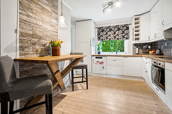 Boligen er godt vedlikeholdt med flere påkostninger i nyere tid som oppgradering av kjøkken, oppgradering av vaskerom, noen nye overflater, nytt gulv i flere rom, for å nevne noe. Hoveddelen består av bla. 3 soverom, baderom, vaskerom, kjøkken og stue med rikelig av plass, store vindusflater samt utgang til verandaen hvor godværsdagene kan nytes. Utleiedelen i andre etasje, har egen inngang i første etasje, med 2 soverom derav ett soverom benyttes som stue, bad/vaskerom og kjøkken.