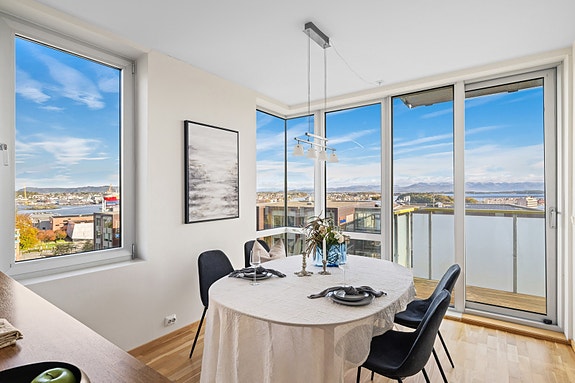 I tillegg får du heis, vannbåren varme og fast parkering i lukket anlegg. Fantastisk utsikt mot sjø, øyer og fjellene fra Rennesøy til Sandnes.