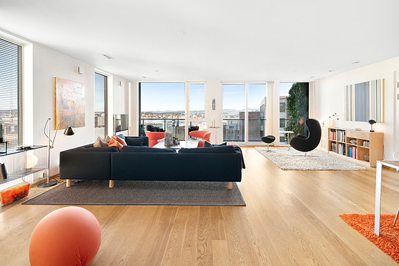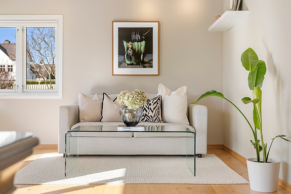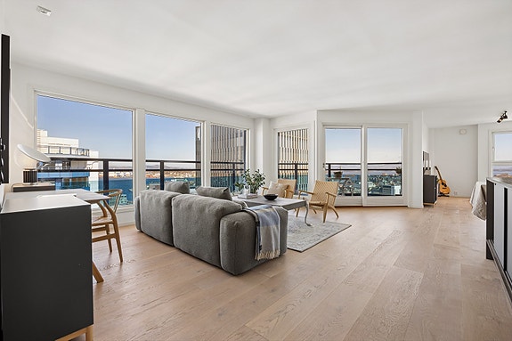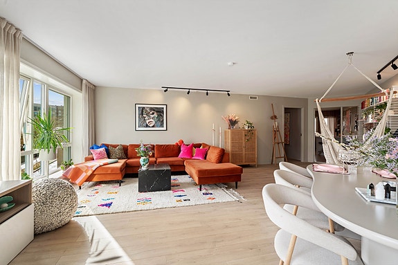 Leiligheten har to soverom, med mulighet for et tredje, og flotte solforhold takket være to balkonger, én mot øst og én mot vest, hvor den ene er overbygget og innglasset. Den luftige stue- og kjøkkenløsningen er moderne, med integrerte hvitevarer og stilren innredning. I tillegg har leiligheten et lyst, flislagt bad og et gjestetoalett for ekstra bekvemmelighet.